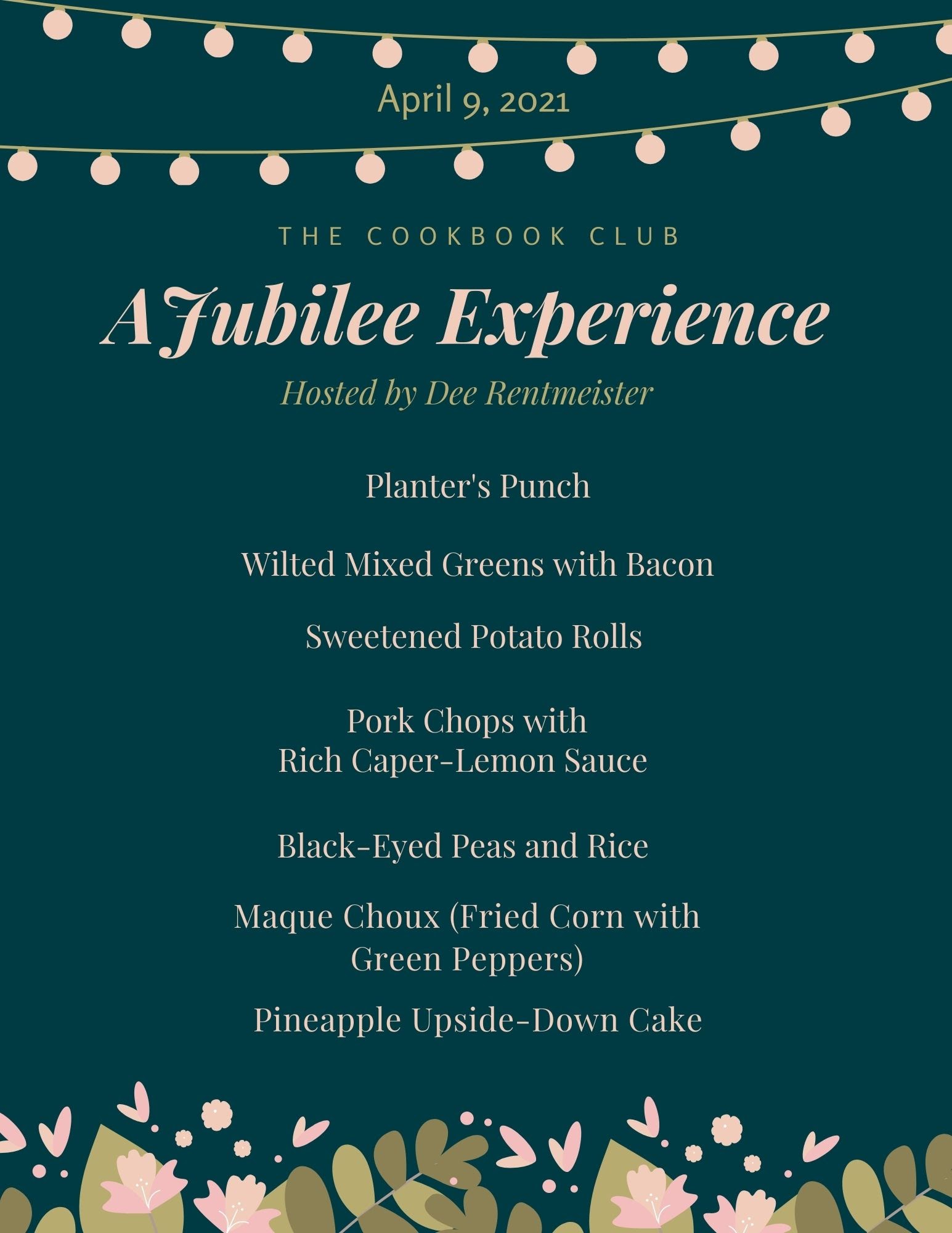 Hallelujah! After spending most of a year locked down and masked up, the Cookbook Club is fully vaccinated, which means a celebration, or “Jubilee”. We chose Jubilee: Recipes from Two Centuries of African American Cooking by Toni Tipton-Martin as we celebrated spring and our friendship.
