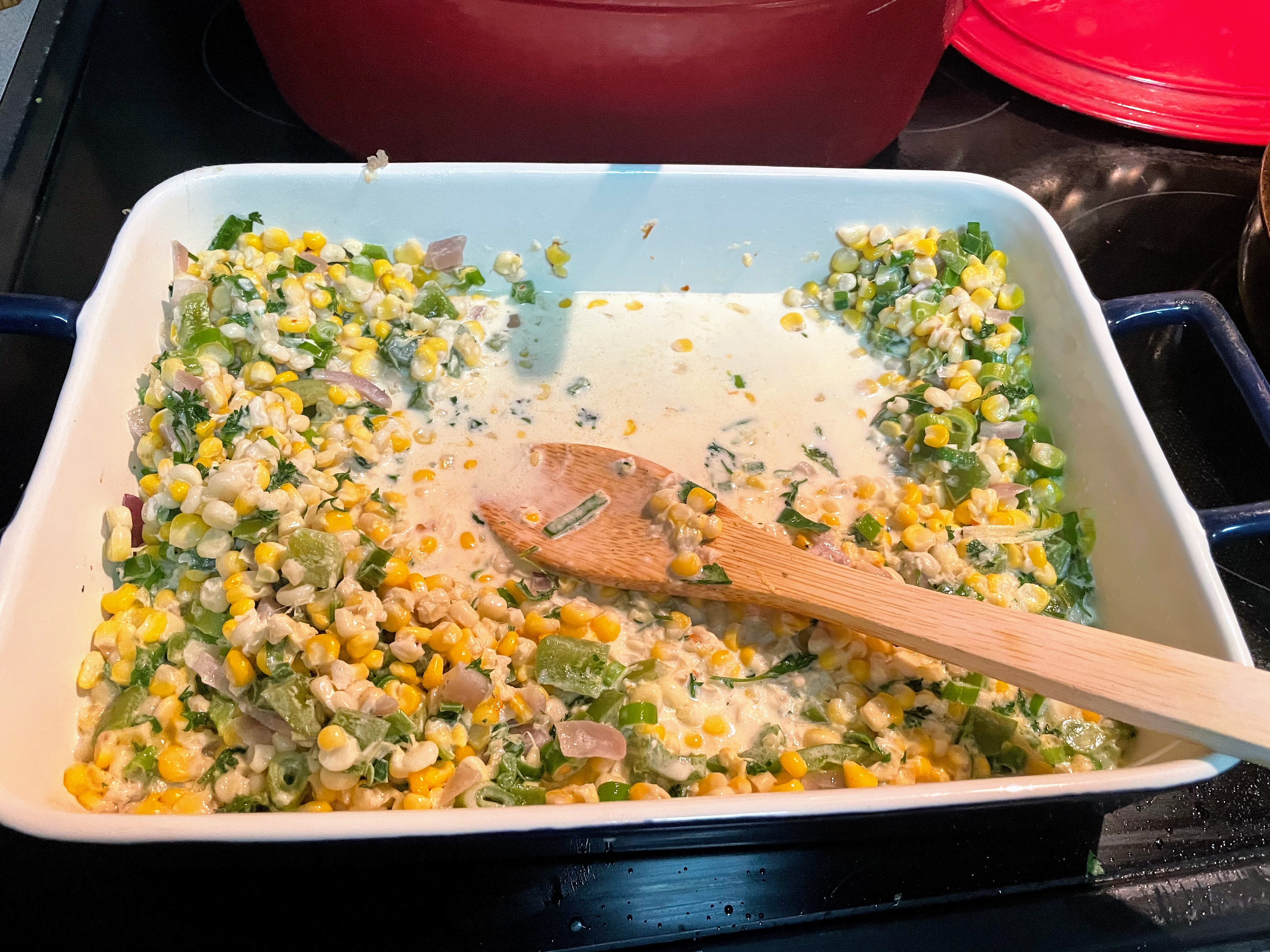 We had some delicious side dishes! Nancy made the Sweetened Potato Rolls (notice how she selected the “Sweet” recipe) and the Black-Eyed Peas and Rice; Laura made the Maque Choux (Fried Corn with Green Peppers). I could have made a meal on the sides alone! Recipes are here: Sweetened Potato Rolls – https://www.austin360.com/foodanddining/20191118/jubileersquo-writes-new-narrative-about-black-food-in-america; Black-Eyed Peas and Rice – https://www.shondaland.com/inspire/books/a30141244/toni-tipton-martin-interview/; Maque Choux – https://buzzfixtoday.com/maque-choux-for-corn-season/