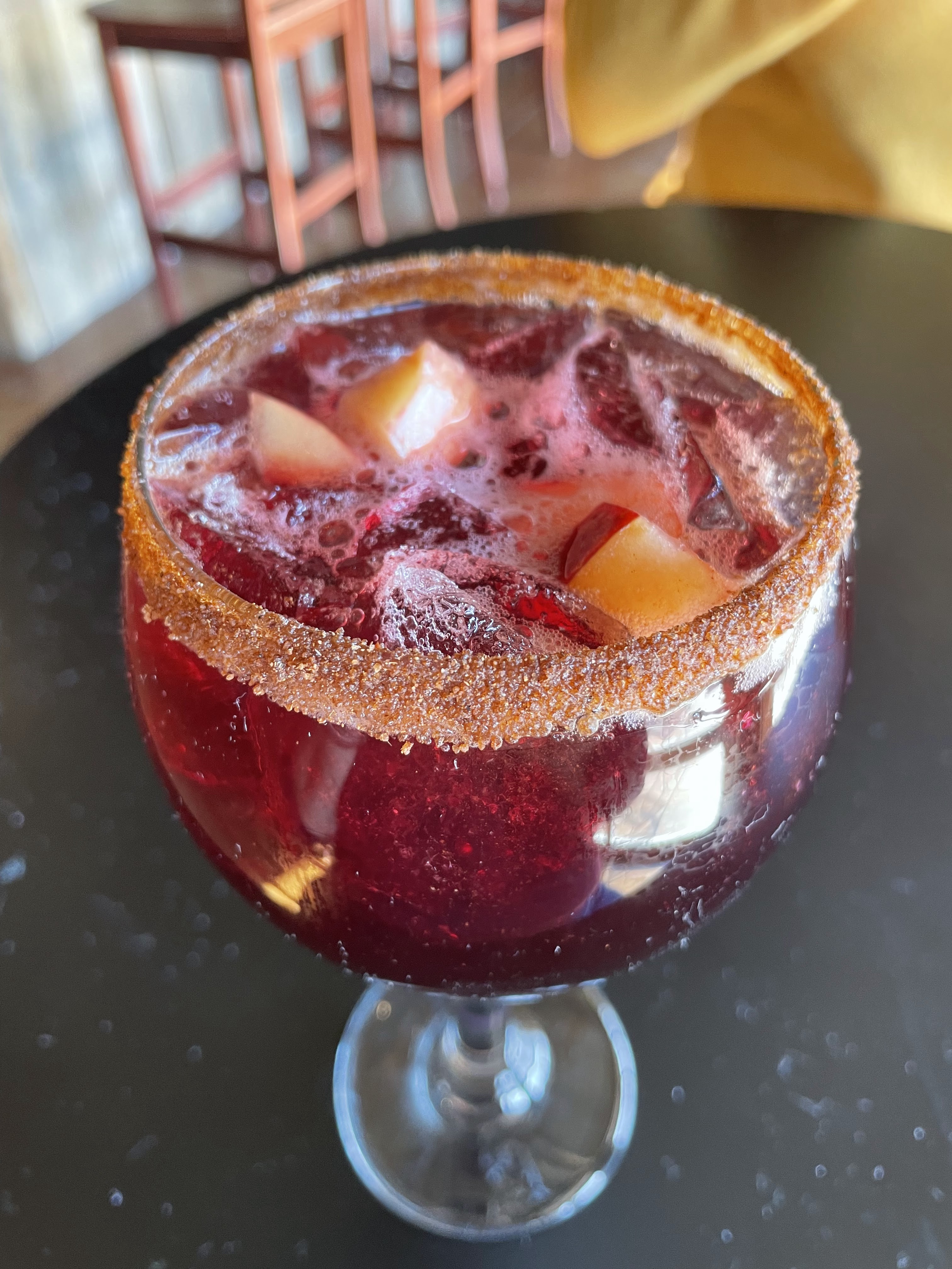 We were greeted by Kyle, and he instantly made us feel welcome. It was a Friday, and I was surprised we were the only ones there. The benefits of retirement! Kyle explained the wines to us – they do not make their own wine, and they are known for their sangria and a whiskey drink called Honey Pot. They were featuring Apple Strudel Sangria, and we were surprised that it was red instead of white. Kind of like a mulled wine but cold – and really good! We both ordered the sangria, and had a yummy lunch of grilled cheese, tomato soup, chips, and spanakopita bites.