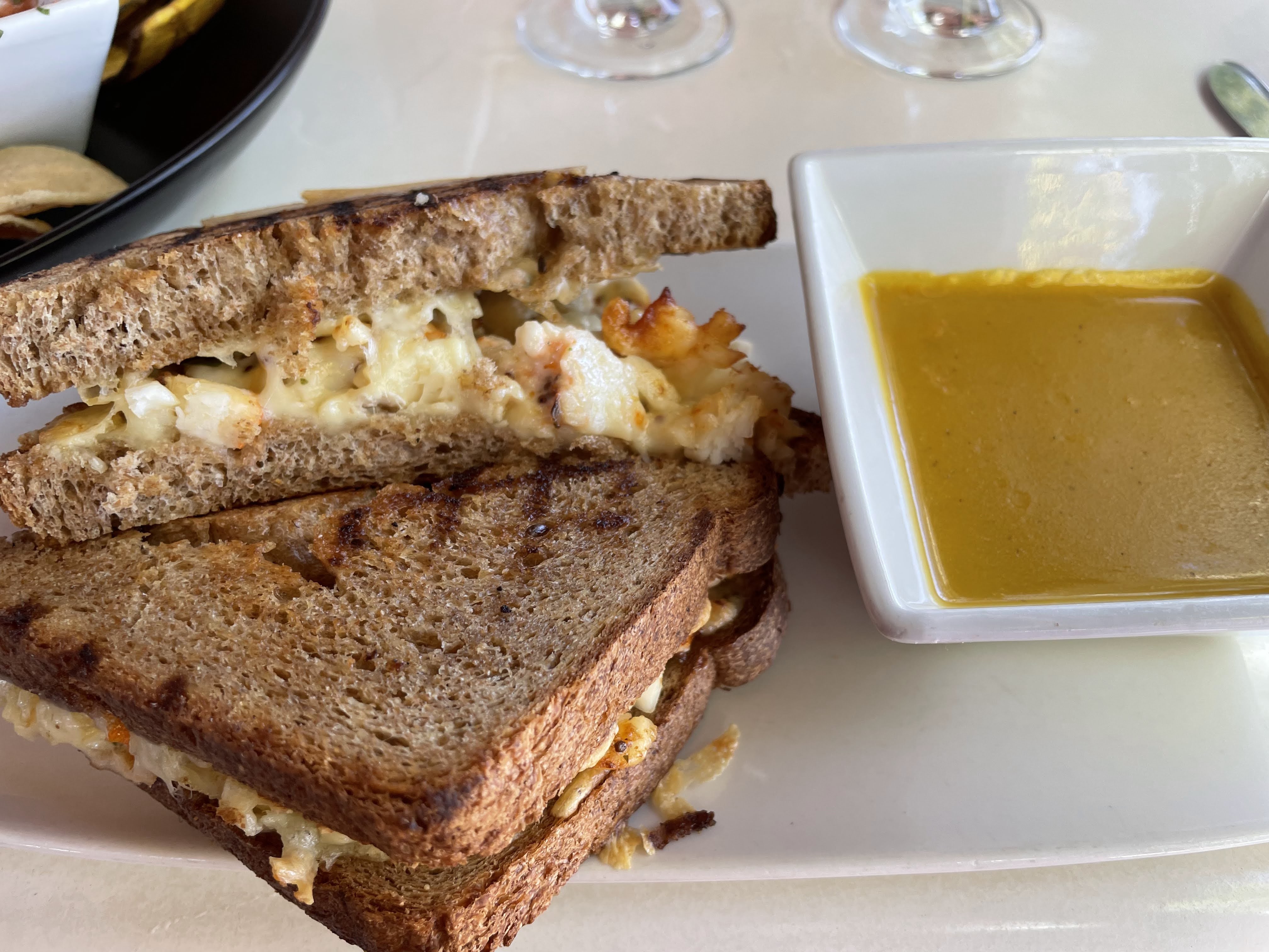 One of the days we rented a golf cart to scoot around the peninsula. Note to self – next time make sure all of the seats are facing forward. Our golf cart had four seats, but two of them were rear facing. Traffic on the peninsula is light, and consists of golf carts, bicycles, and motorized vehicles. It was a little alarming for me and Karen to see a car or pickup truck come barreling up to our little golf cart! Plus the road has several speed bumps, and if you are riding in the back, there is a chance you could get bumped off if the driver doesn’t take it slow 😜 We ended up having lunch at the Maya Beach Hotel Bistro – can anyone say lobster grilled cheese?