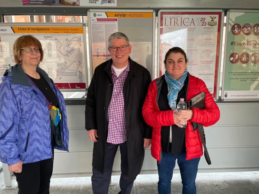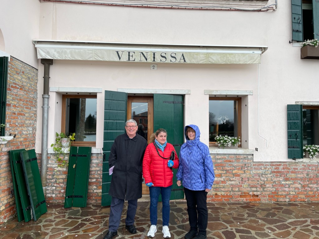 Of course, the day we chose to go it was raining and chilly. The ride to Mazzorbo was easy, and the winery was not very far from the Vaporetto stop. We were early though … by about 45 minutes or so. And we didn’t exactly know how to enter. There was a lot of activity and what looked like construction or remodeling going on in what we thought was the entrance. Never fear – Susan and Tim found a cafe around the corner that was affiliated with the winery, so we were able to warm up and get a coffee.
