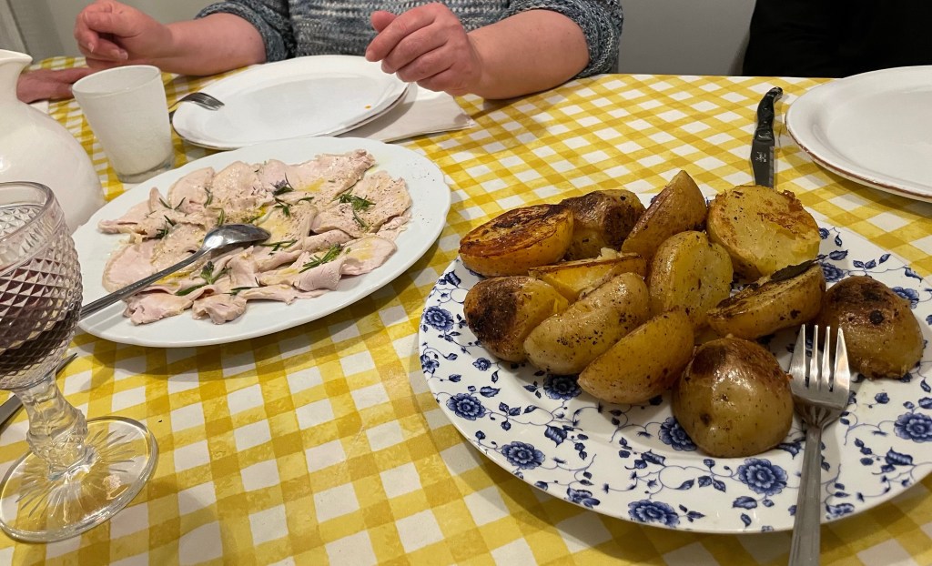 Our meat course was a pork loin that had been braised in white wine and herbs, then chilled overnight. It was very tender and good. And the potatoes! Have I mentioned their roast potatoes yet? They are to DIE FOR! And Patrizia served some as a side – I was in heaven!