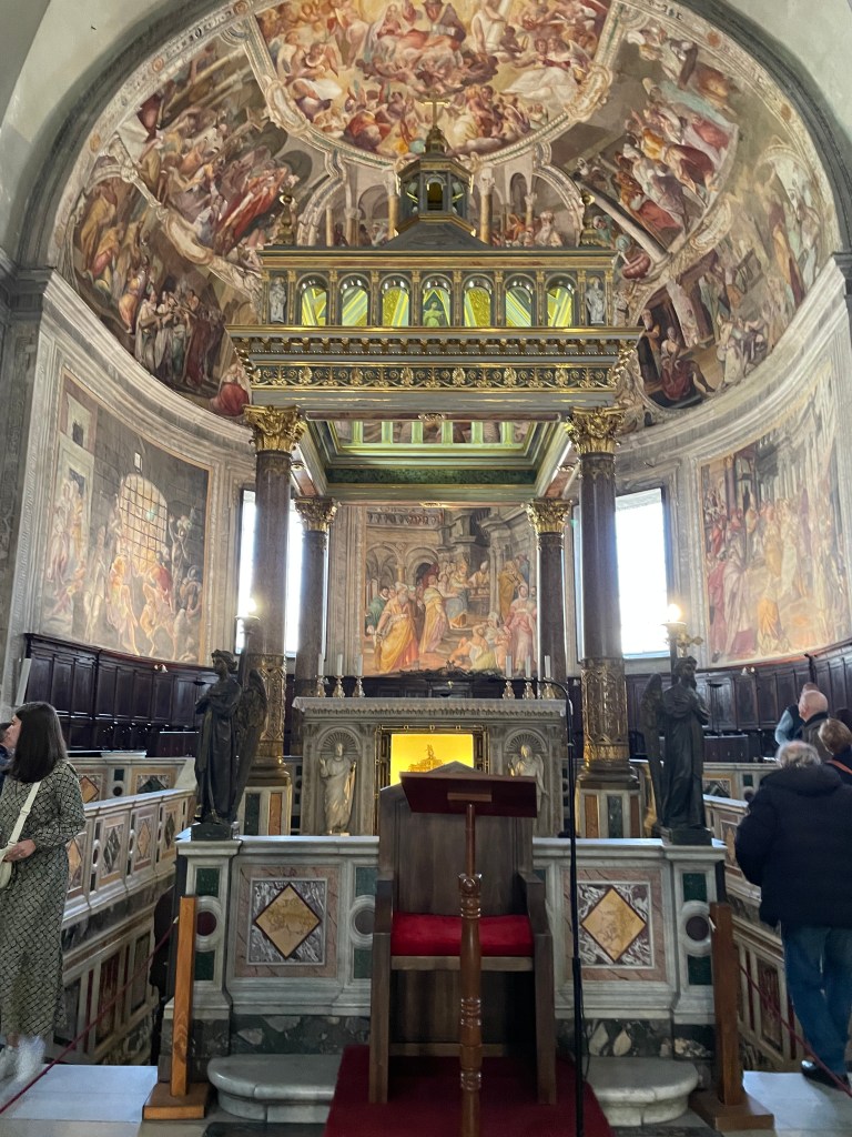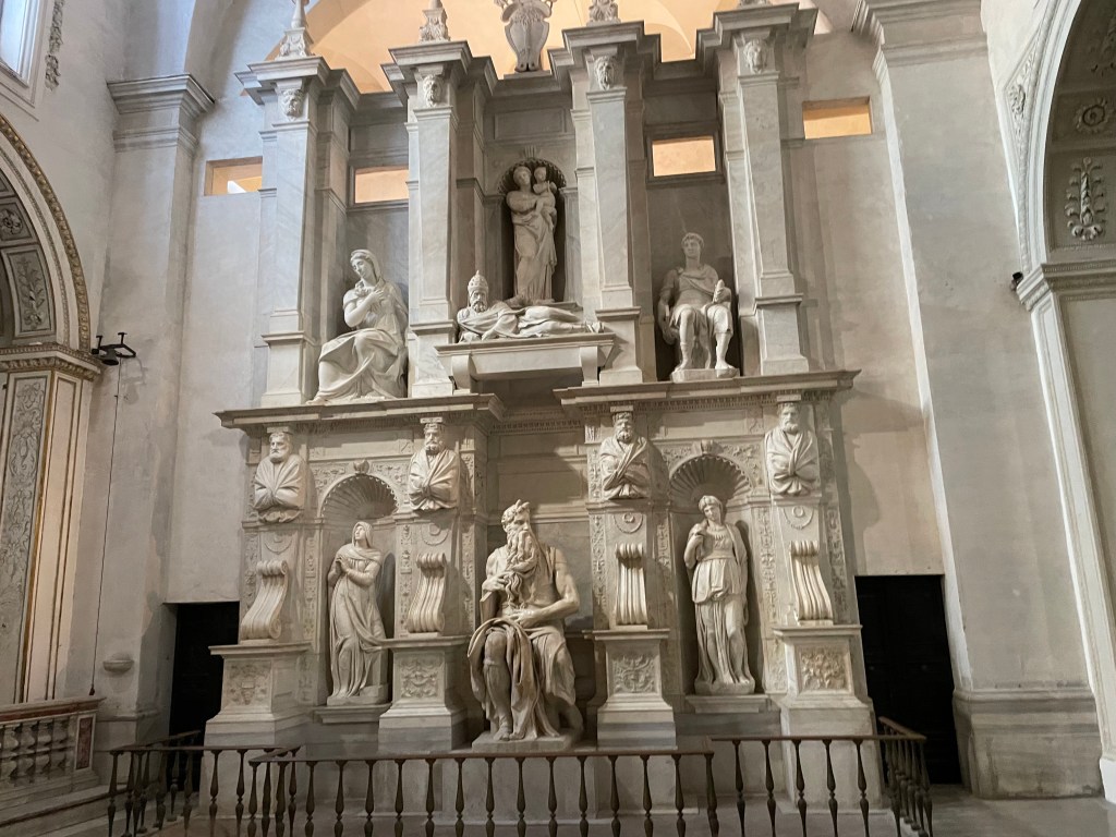 After our visit to the Basilica of Saint Clement we headed to St. Peter in Chains. Susan remembered from a previous trip a little food truck parked outside of the church, and it was still there – so we sat on the church steps eating gelato until they opened 😊 The relic of the chains that bound St. Peter when he was imprisoned in Jerusalem are housed here. But the main attraction is Michelangelo’s statue of Moses, which is part of the tomb of Pope Julius II.