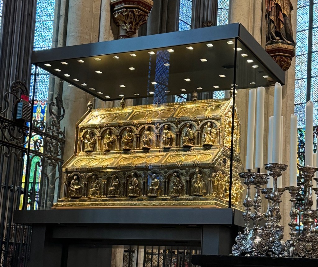 Although damaged by bombs in WWII, the cathedral was one of the only buildings left standing in Cologne. There is also a connection to The Monuments Men movie – an American Catholic Chaplain, Philip Hannan, was able to sway the German Archbishop into signing a document giving the Americans authority to protect the art and liturgical objects in the cathedral after the war.