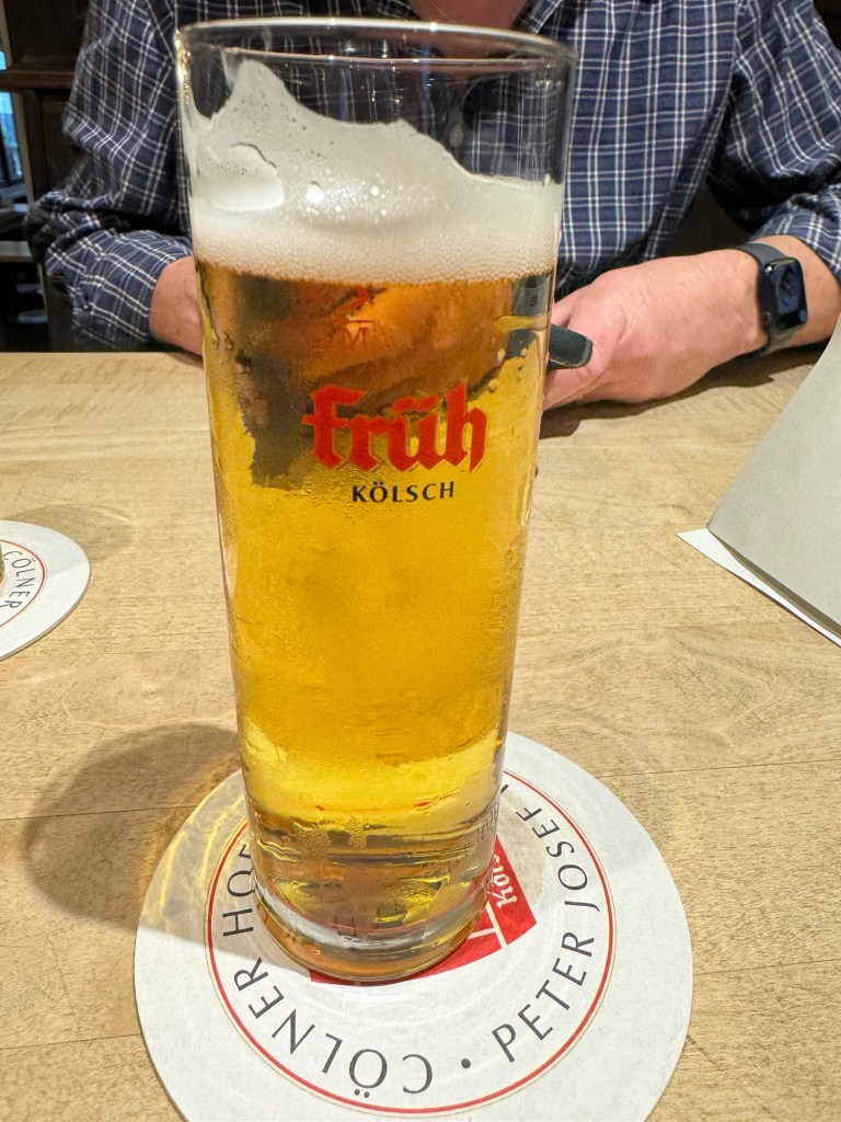 It was late afternoon and we were starving, so off we go in search of a typical Cologne beer hall for some food and drink. We found the Brauhaus FRŰH am Dom (FRŪH Brewery House at the Cathedral). Here we got acquainted with Kölsch beer, a nice, crisp, light-style beer with elements of both lagers and ales. The beers are served in a stange glass, a tall, thin glass that holds about six ounces of beer. This size is great for me, since I am a slow drinker and my beer tends to get warm before I finish it.