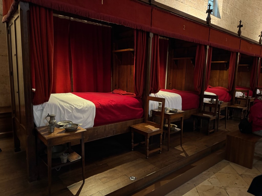 The next morning it was raining, so we decided to go to the Hospices de Beaune, a charitable hospital for the poor founded in 1433. A charitable wine auction has also been hosted here since 1859. The buildings are well preserved, and you can get a good look at what it was like to be cared for in this institution through the years. The glazed tile roofs with their geometric patterns are characteristic of Burgundian architecture.