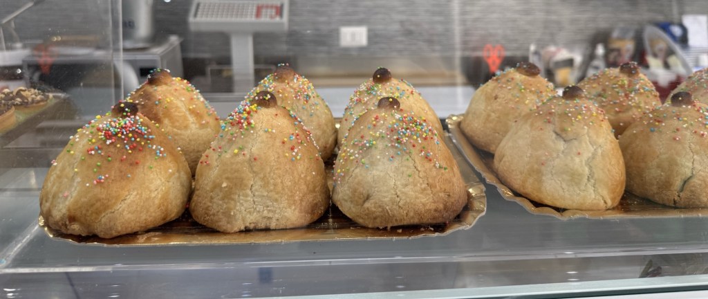 We got on our bus and headed to Sambuca, the original home of the 1 Euro houses. Our first stop was Peccati di Gola, a local bar that is famous for their minni di virgini (Virgin’s Breasts), a delicious pastry that looks like … well … breasts. The recipe dates back to 1725 when a nun created these to celebrate a local wedding. Now they are a part of the Sicilian culture, and something not to miss while you are there.