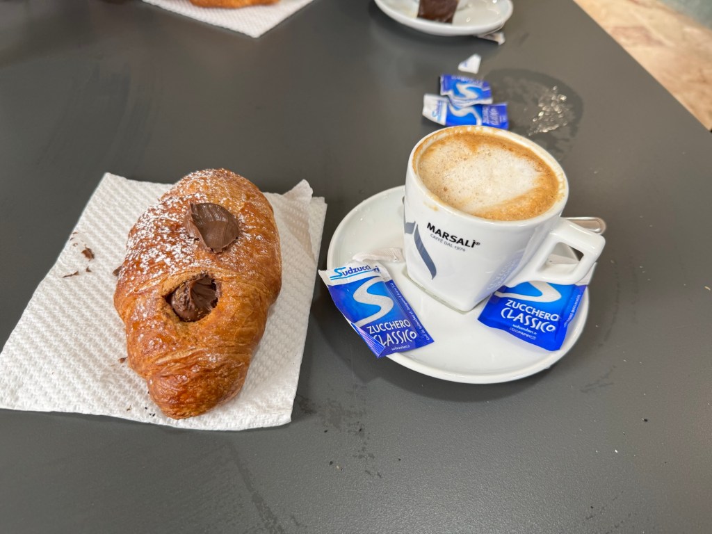 Normal Italian breakfast – a cappuccino and a cornetto cioccolato (chocolate croissant)