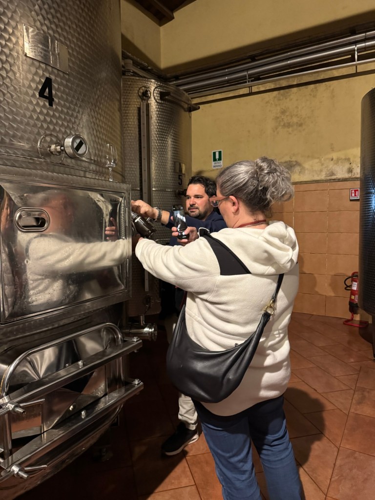 Our next stop was Caseificio La Sala, to see the cheese-making process and taste some warm ricotta cheese. We were also treated to a spontaneous concert by our cheese maker, Giovanni, who also got everyone involved by making us sing our national anthem 😆! Which then was followed by a dance party to Tutta L’Italia! Giovanni makes the ricotta fresh every day, and always sells out. People leave their tins at the shop to be filled, or just come by about the time it was finished. The cheese was still warm, a little soupy, and served with Italian bread. Yum!